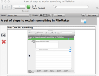 I built a simple database (Download FM-Screen-Capture.zip) consisting of two tables, Lessons and Lesson Steps. This is a very simplified version of the documentation software ScreenSteps. ScreenSteps has many more features, including the ability to markup screenshots with arrows, boxes, text, blurs etc. ScreenSteps is well worth a look for any FileMaker Pro developers who are serious about supporting their users. Sometimes, a developer just needs to have some simple documentation within their FileMaker Pro solution and the ability to do some quick screen grabs of their software is useful.