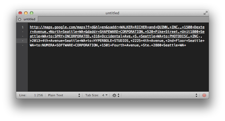 Next, paste the URL into a text editor, such as TextMate (Mac) or Notepad (Windows). If the text editor you have chosen displays URLs as clickable links, you should be able to see where the URL breaks and then go about adjusting either the text in the address, or adding more error correction to the script to catch this specific type of error. In the screenshot below, there is an extra space in the URL. If this is sent to Google Maps, the results will not display correctly.