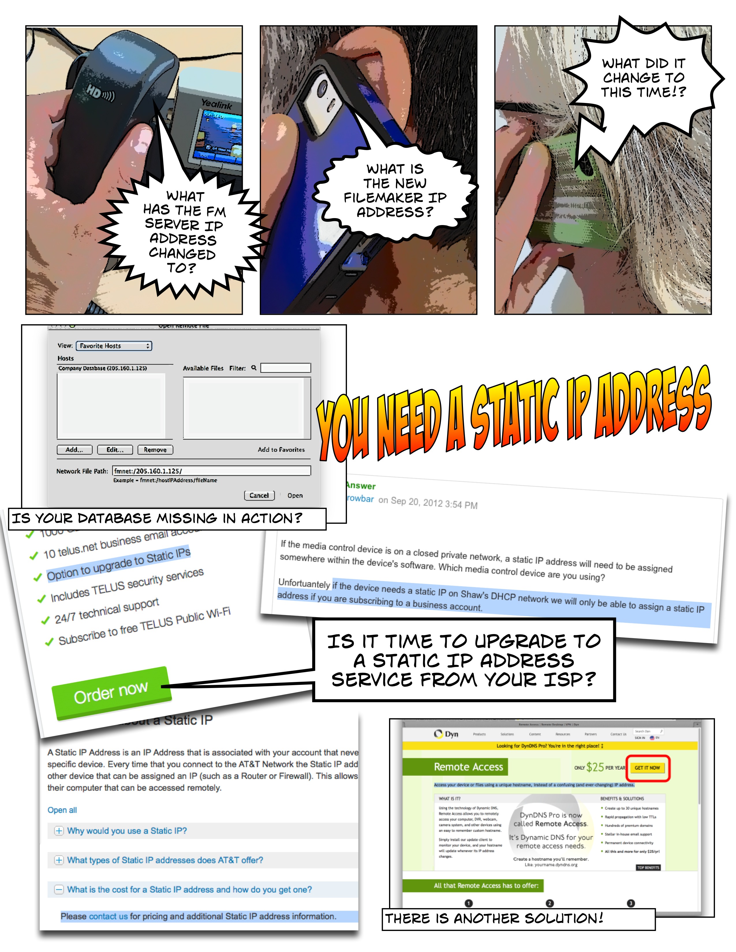 Once you have your FileMaker Server setup and accessible remotely, I recommend setting up Dyn.com Remote Access service. Their tagline is “Access your device or files using a unique hostname, instead of a confusing (and ever-changing) IP address.”