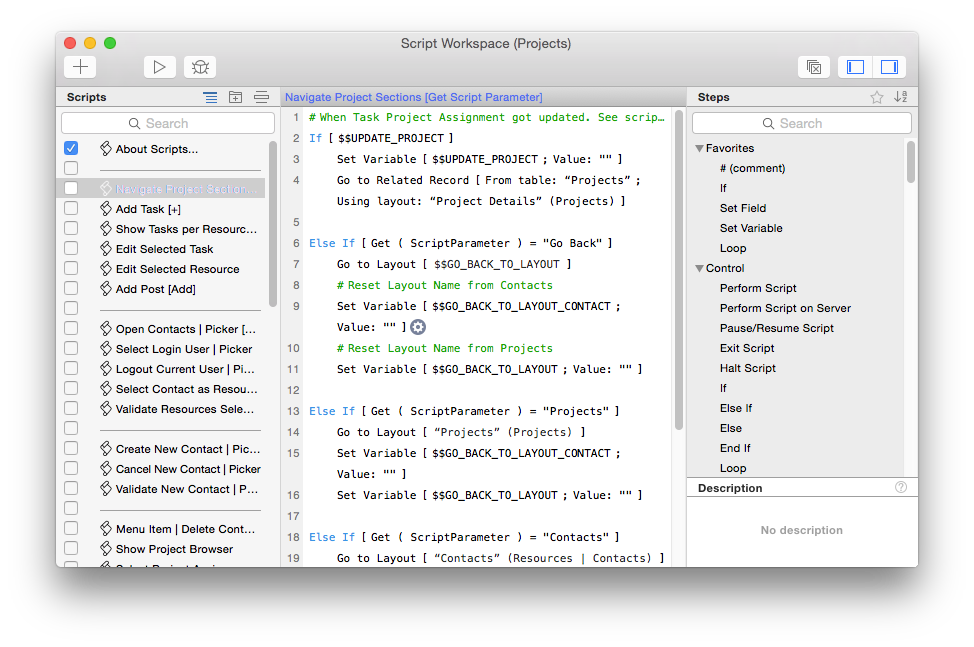 The Script Workspace brings an IDE-like editor to FileMaker’s point and click programming. In the little time I have had with it, it seems like the new script editor will take some time to get used to, but could drastically speed up programming in the longer term. This approach has been requested for years by developers and it looks like FileMaker Inc. has finally delivered, bringing the best of both worlds, an open typing environment with enough error capture to prevent users from writing bad syntax.