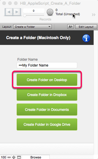 Someone on one of the Facebook FileMaker Group pages recently asked for a simple method, using AppleScript of creating a folder on the Desktop. FileMaker Pro can generate a variety of file formats, including Text, PDF and Excel, and it is possible to script the names of these files. It is also possible to script saving files to specific locations on your hard drive. Unfortunately FileMaker lacks the ability to create folders without the use of plugins. AppleScript on the Macintosh gives FileMaker this ability. I found the basics of this script on Stack Overflow. I thought I would flesh it out into a demo file, put in some error checking and share it here.