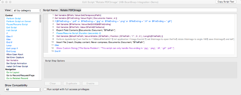 In my previous blog post I talked about automating scanner documents into FileMaker container fields using AppleScript. This was based on a customer request. Logging in to that system recently, I noticed that it was fairly common for staff members to scan documents in upside down. A web search found me an AppleScript to flip PDFs and Images using the Image Events utility, which is included in most modern OS X installs. From this, I made a FileMaker Pro script for images and PDFs. I made it work with both PDFs and images because I also noticed sometimes jpegs and png files were ending up in the container (rather than just the specified PDFs).