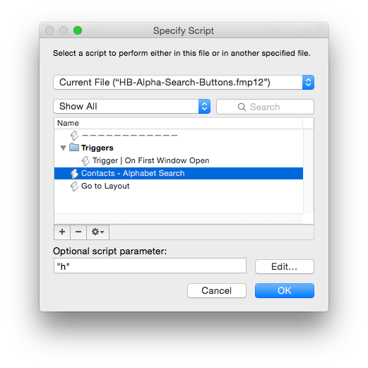 The script can be reused on different layouts for different types of searches. Rather than taking the time to reset 26 buttons in the button bar to a new script, simply put a switch in the script to look at the context the script is being run from. In this case, I chose Get(LayoutTableName) as the switch, on the premise the the underlying table name is not as likely to change as the Layout Name.