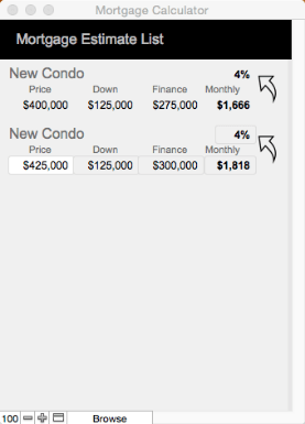 - Store up to three different mortgage scenarios in a record. Vary Cost, Down Payment, Interest Rate and Term to compare multiple payment scenarios.