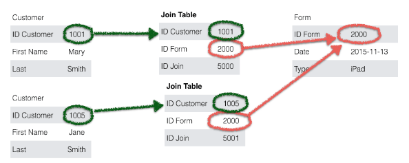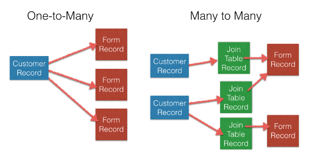 Standard database relationships are created by linking ID numbers between data tables. These fields are referred to as key fields. The image above is an example of a regular database relationship—one record (the Customer) can be linked to multiple (Form) records. In this example a Customer record could be continuously updated with a more current form — One Customer to Many Forms.