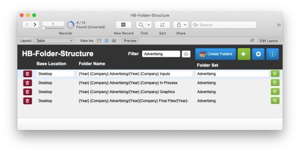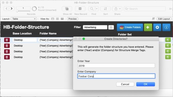 In keeping with the principle, “Why use a screwdriver, when I have this hammer right here?”, I decided, instead of just downloading a free utility from the Mac App Store, I would build folder creation functionality using FileMaker Pro Advanced 17. With FileMaker 17’s new ability to “Create Directories” in the “Export Field Contents” step options, and an old trick to delete files from the OS, this demo file demonstrates a new and useful capability in FileMaker to create pre-defined folder structures, pretty much anywhere on your computer or related cloud directories.