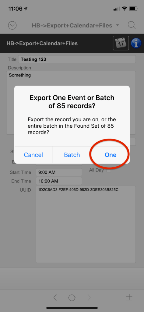 - Choose the ‘One’ option, or Batch if you are exporting a bunch of ics events.