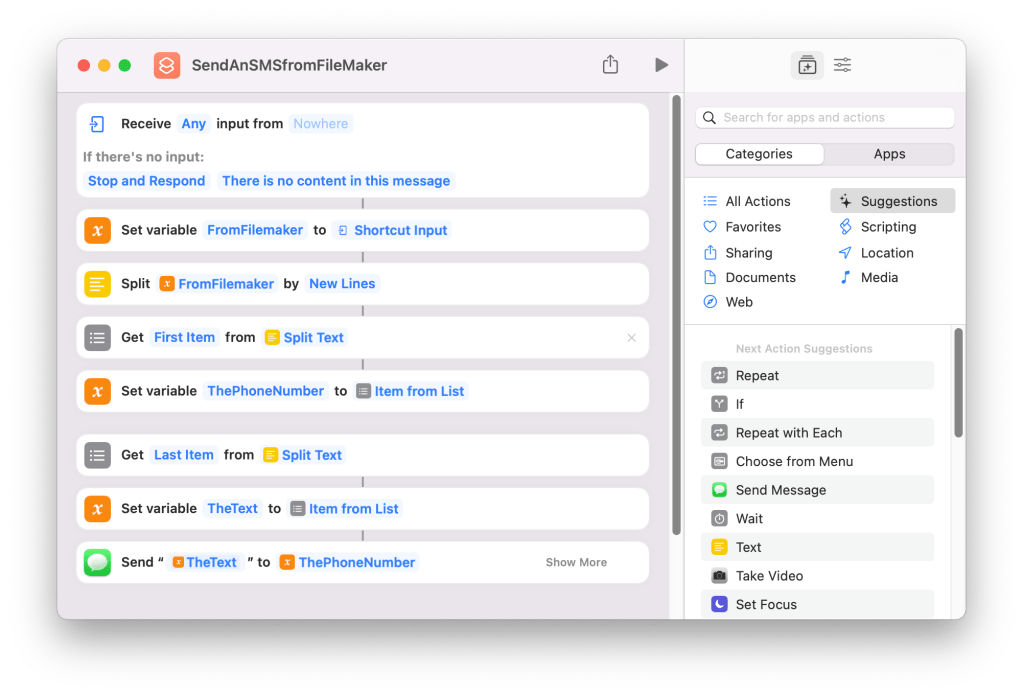 The screenshot below is the Apple Shortcut that the FileMaker script calls. I am relatively new to Shortcuts, so forgive me if I have done things wrong. It seems to work though, with the exception of a text message with a ‘/’ at the end. If anyone knows how to get rid of this, please let me know and I can update the demo file.