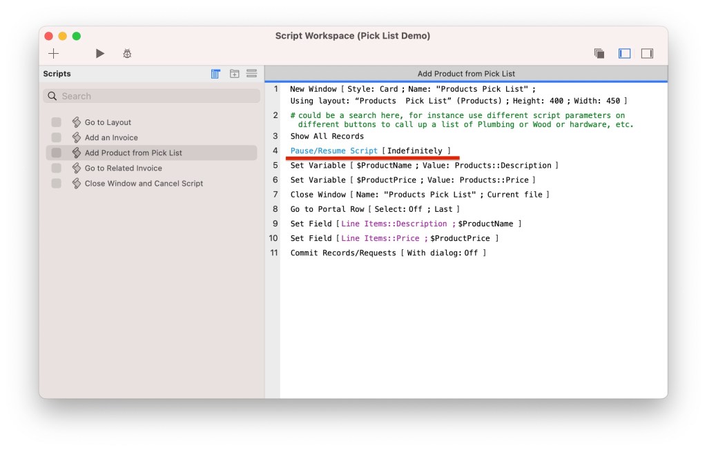 • Pause Indefinitely – It pauses in the middle and waits for user interaction. If you look at the ‘Add’ button on the pick list layout, you will see it just say ‘Continue Script’. When they click on an item in the Product List, the script resumes.