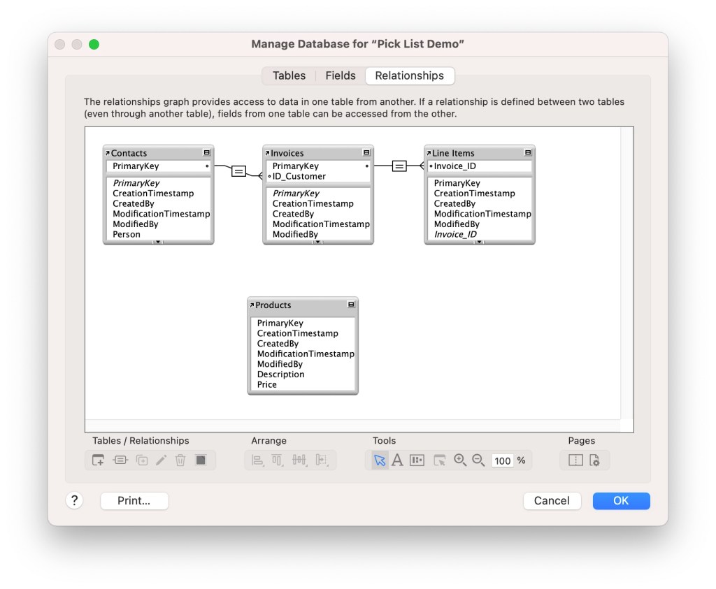The beauty of pick lists is that they don’t require any complicated relationships to display the data. The example I am using is a simple invoicing solution, where you have lots of products to pick from and you want to make that accessible on an invoice. Below is the relationship graph of the Demo File. Contacts have Invoices, Invoices have Line Items and the Products table has no linkages.