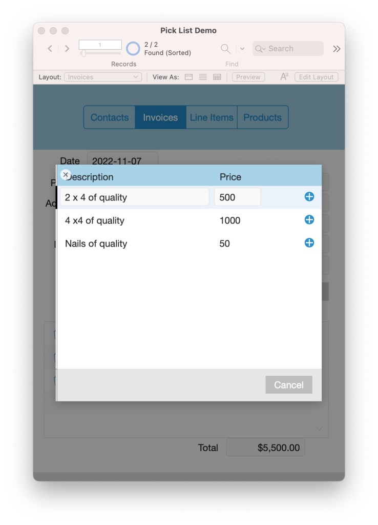 You can test the Pick List from the Invoices layout of the Demo File. Click on ‘Add Product’ button and up pops the pick list.