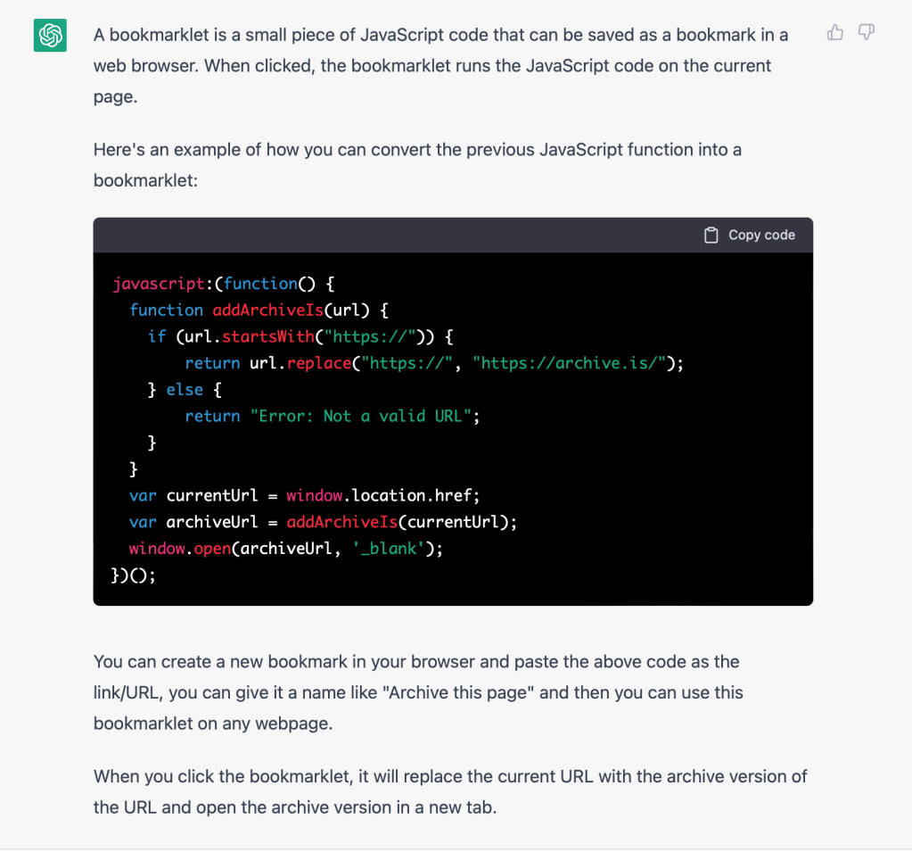 With plenty of time and patience, I might have been able to figure this out myself. Cue much searching for code samples and tweaking to get it to work. Instead, I asked the AI-based ChatGPT to write me a bookmarklet. In 30 seconds, I had my response. I added the Bookmarklet and it works! Call me pretty impressed.