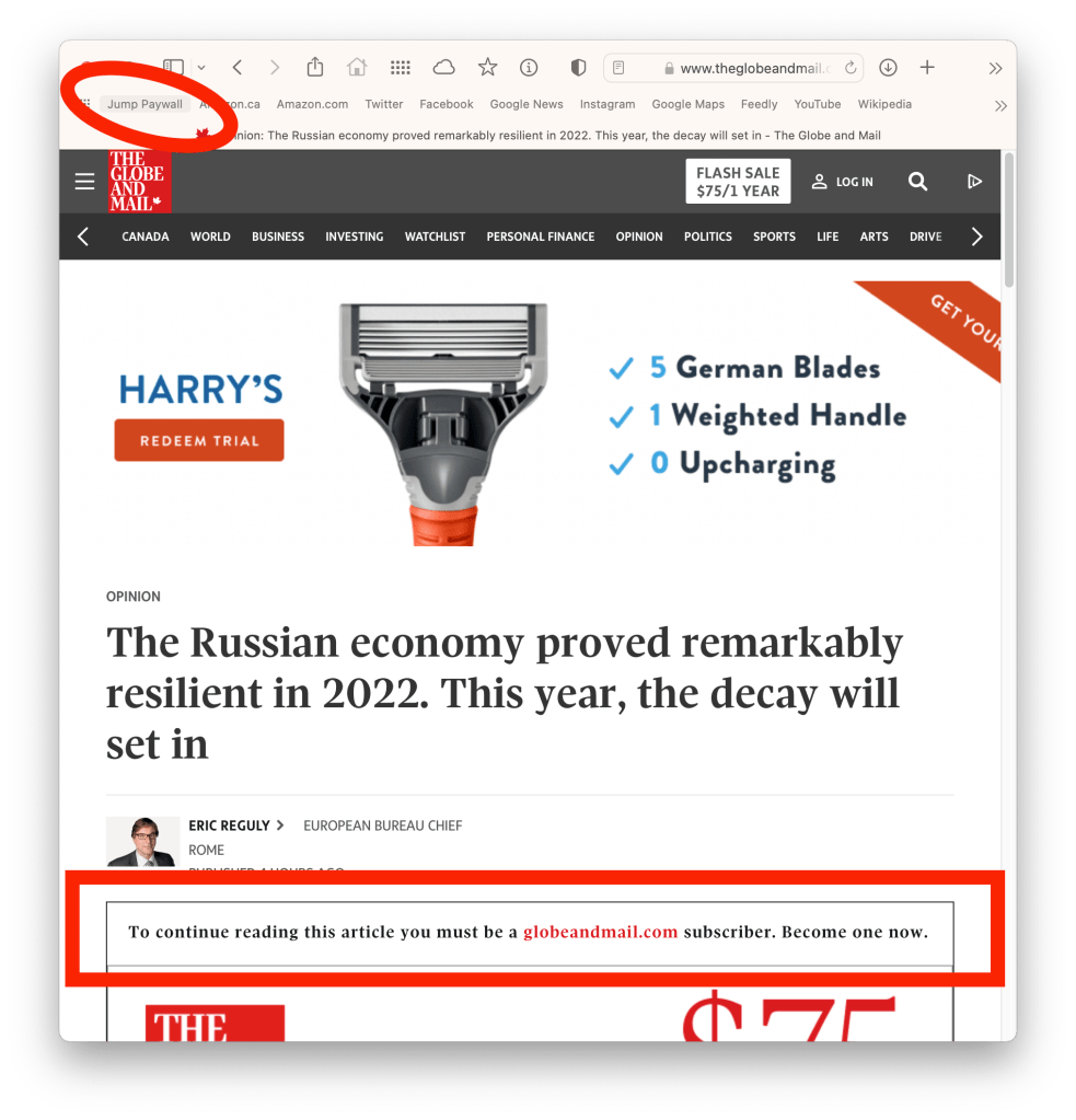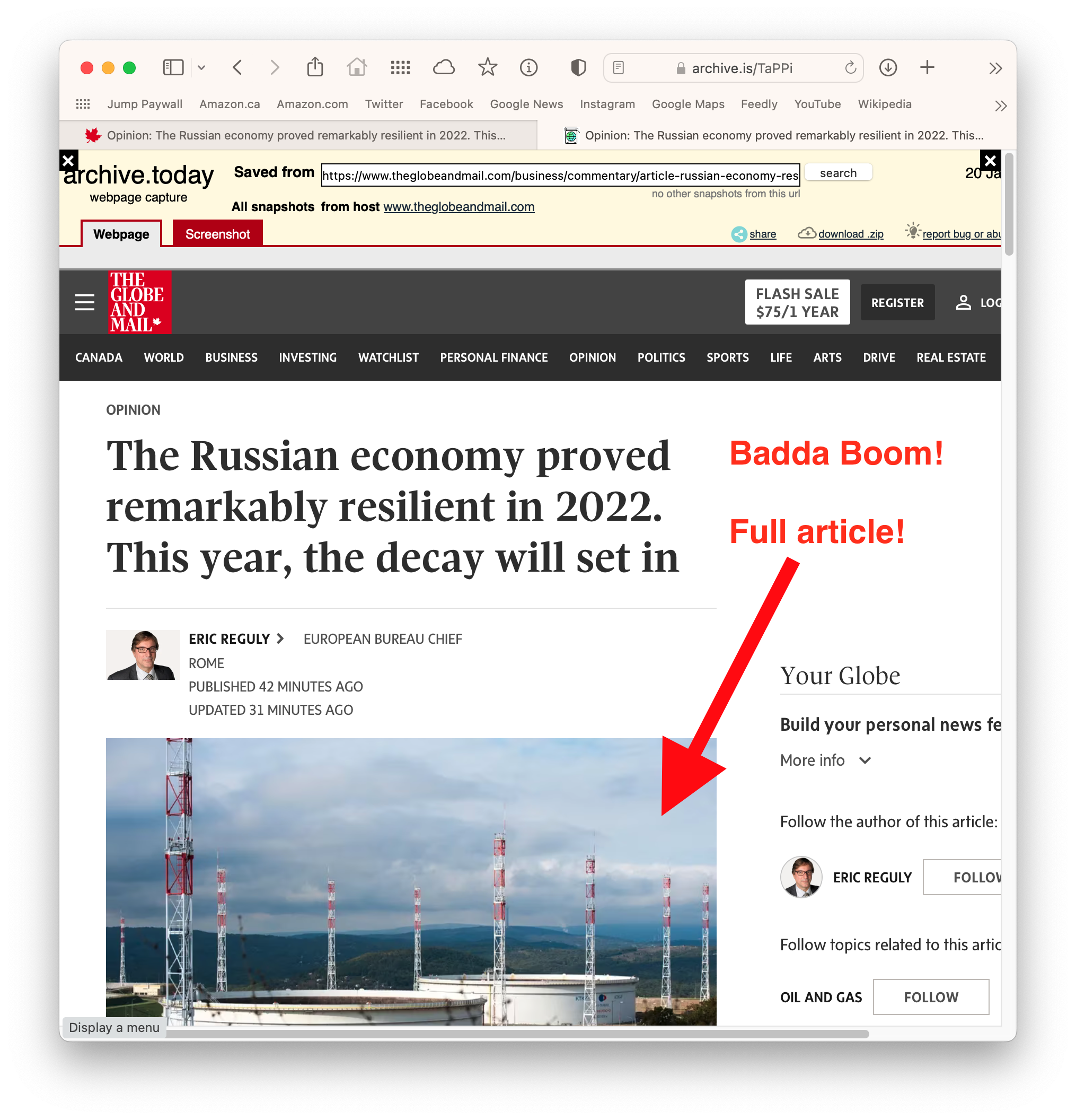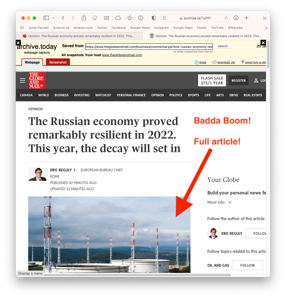 I recently was exposed to, via an algorithm, a YouTube Short about getting around paywalls. They claimed that when encountering an article behind a paywall if the text ‘archive.is/’ is added at beginning of a URL, it takes the reader to an archive of the article, thus avoiding the paywall. I tested it and it seems to work with New York Times and The Globe and Mail. I haven’t tested others yet.