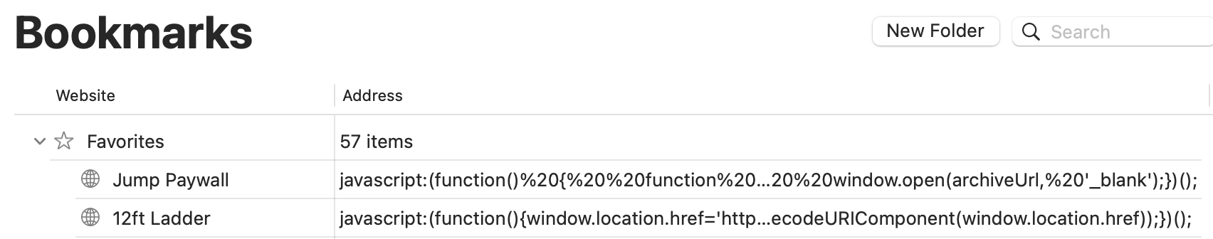 Update: 2023-04-04 – 12 Foot Ladder is another website that does the same thing, except I believe it is just ignoring the Javascript used by many web sites to block access. 12 Foot Ladder appears to get over most of the paywalls that aren’t archived at archive.is. Same approach, create a bookmark, rename it 12 Foot Ladder and put this javascript into the URL field: