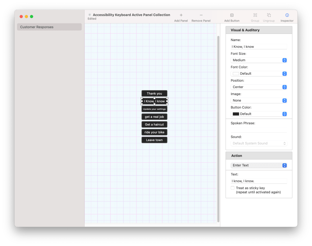 This is an exciting and useful technique which employs a built-in Accessibility feature that is in every Macintosh. Custom Panels in Mac OS’s Accessibility Keyboard panels can be a powerful tool for streamlining repetitive tasks. By creating a set of custom buttons, you can quickly and easily perform a variety of actions, from typing pre-defined text to executing scripts or launching applications. Whether you’re sending boilerplate text responses in an email or entering data into software like FileMaker Pro, custom panels can save you time and effort.