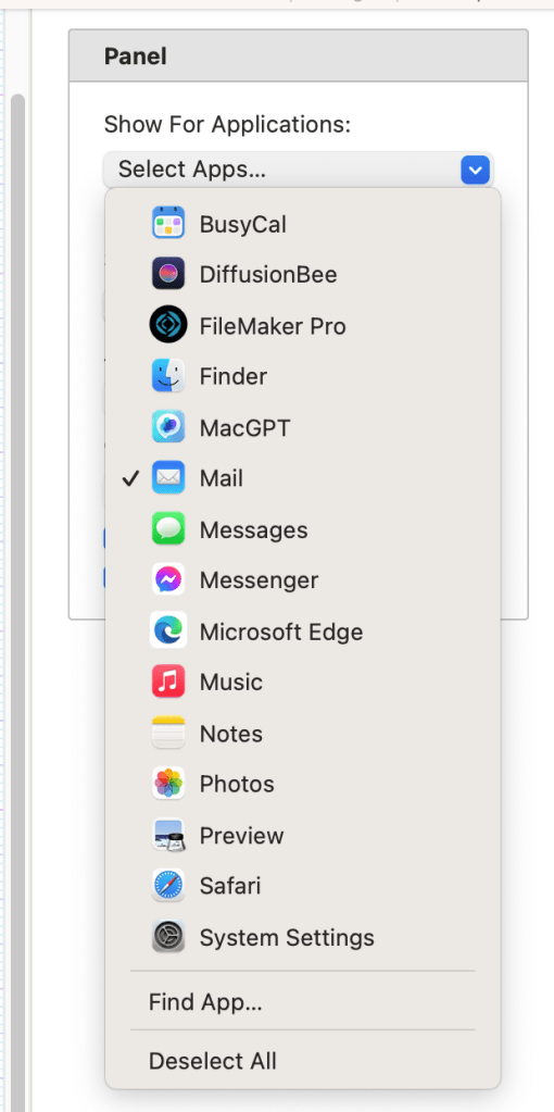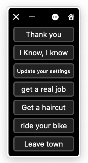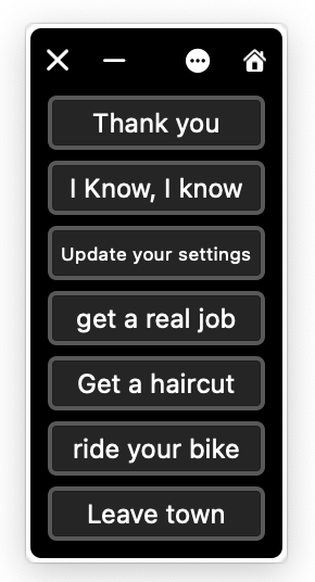 This could be useful for designing a custom set of text boilerplates to quickly add to an email or in a data entry situation. These panels allow you to create a set of custom buttons that can perform a variety of tasks, from typing pre-defined text to executing scripts or even launching applications. I realize you can already do this with Text Replacements, but having a floating panel of well labelled buttons is a more visual approach. It seems you can make the panel as large and complicated as you like and have multiple panels for different uses.