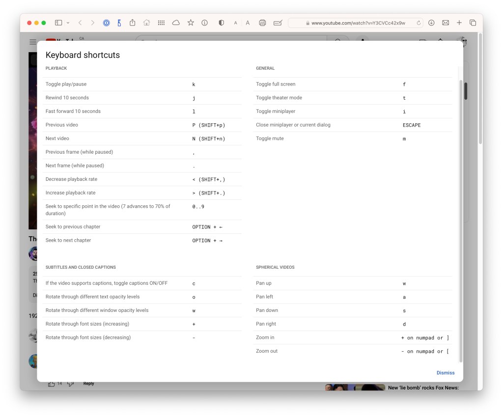 Typing Shift ? brings up a screen with all the handy shortcuts you can use in YouTube to speed up watching videos and optimize your viewing experience.