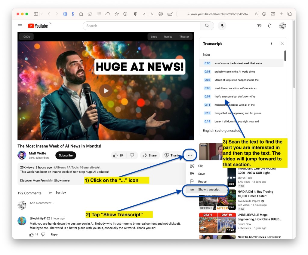 Often, there are closed captions or a transcript associated with videos. This can be a handy way of moving through a video if you just want to find something by scanning the text. Currently, there doesn’t appear to be a search function in the transcript, but perhaps one day. Also, an easy way to download a transcript would be great.